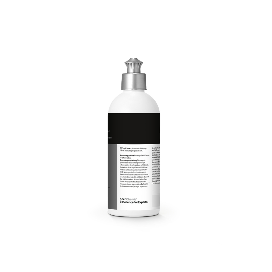 TropicSnow ist dein vielseitiger pH-neutrales Schaumshampoo mit fruchtig, tropischem Duft. Du kannst ihn als Snow Foam in der Schaumkanone, Schaumsprüher oder einfach als Shampoo für die manuelle Fahrzeugwäsche nutzen. TropicSnow bildet einen gleichmäßigen, gut haftenden Schaumteppich, der lange auf der Oberfläche bleibt und so eine effektive Reinigung ermöglicht. Das Beste? Aufgetragene Versiegelungen bleiben erhalten.