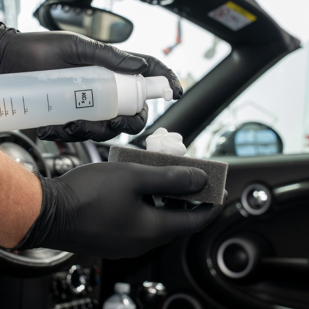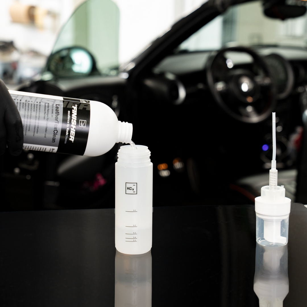 Für eine optimale Reinigung den LeatherTexClean in eine Foamer Bottle füllen. Gib den Reinigungsschaum anschließend auf einen Schwamm oder eine geeignete Bürste und säubere das Leder oder Polster von Naht zu Naht. Schmutz und Reiniger Reste werden abschließend mit einem sauberen und feuchten Microfasertuch entfernt. Leder und Polster solltest du anschließend entsprechend nachpflegen.