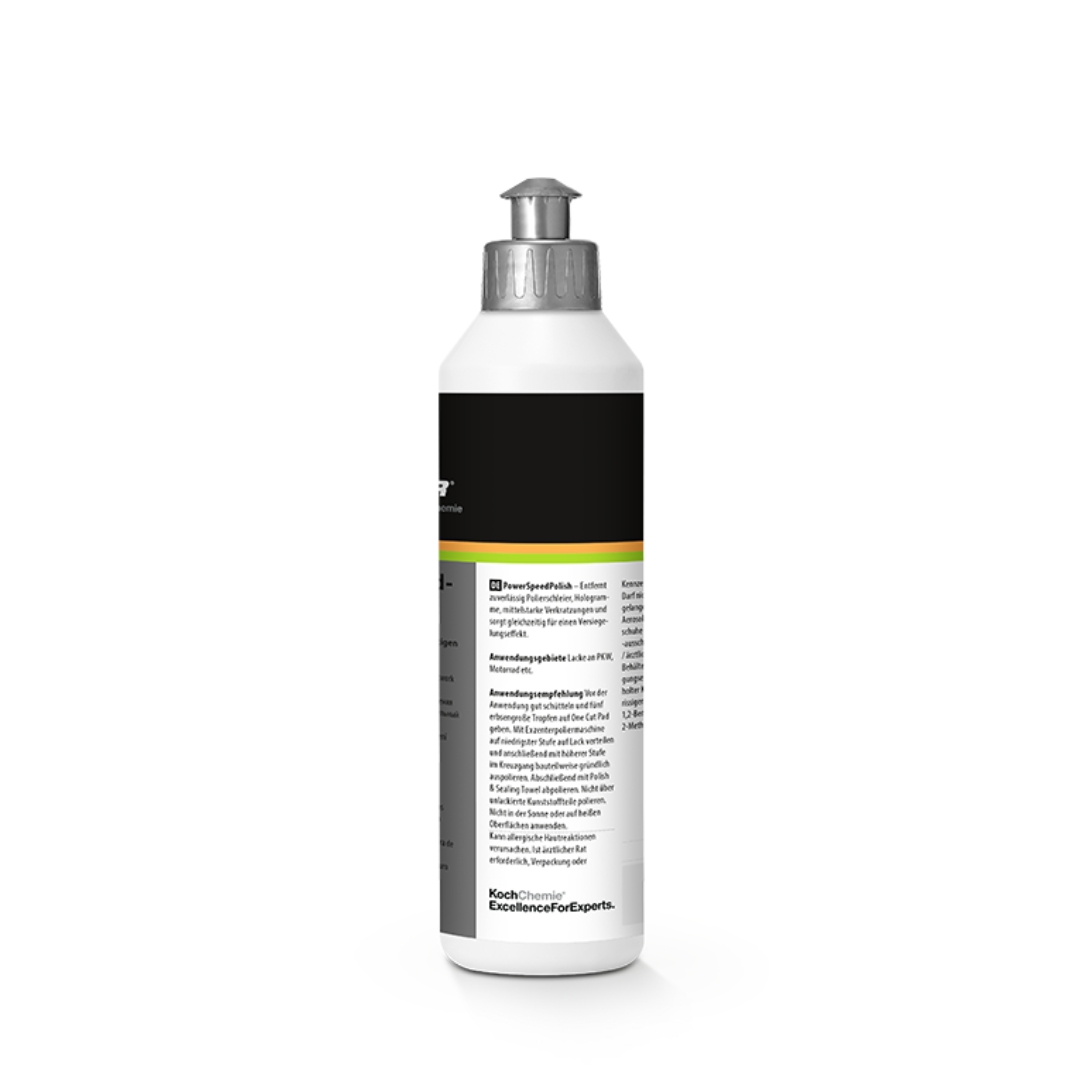 PowerSpeedPolish ist eine leistungsstarke Lackpolitur, die Polierschleier, Hologramme und mittelstarke Kratzer entfernt und gleichzeitig einen Versiegelungseffekt mit Hochglanz hinterlässt.